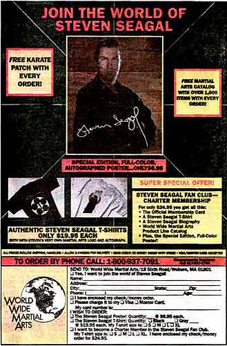 This ad was in a comic book from 1991. Please note that though Steven Seagal, star of nearly thirty remakes of the same movie, will take your cash, he will not take your American Express card.
